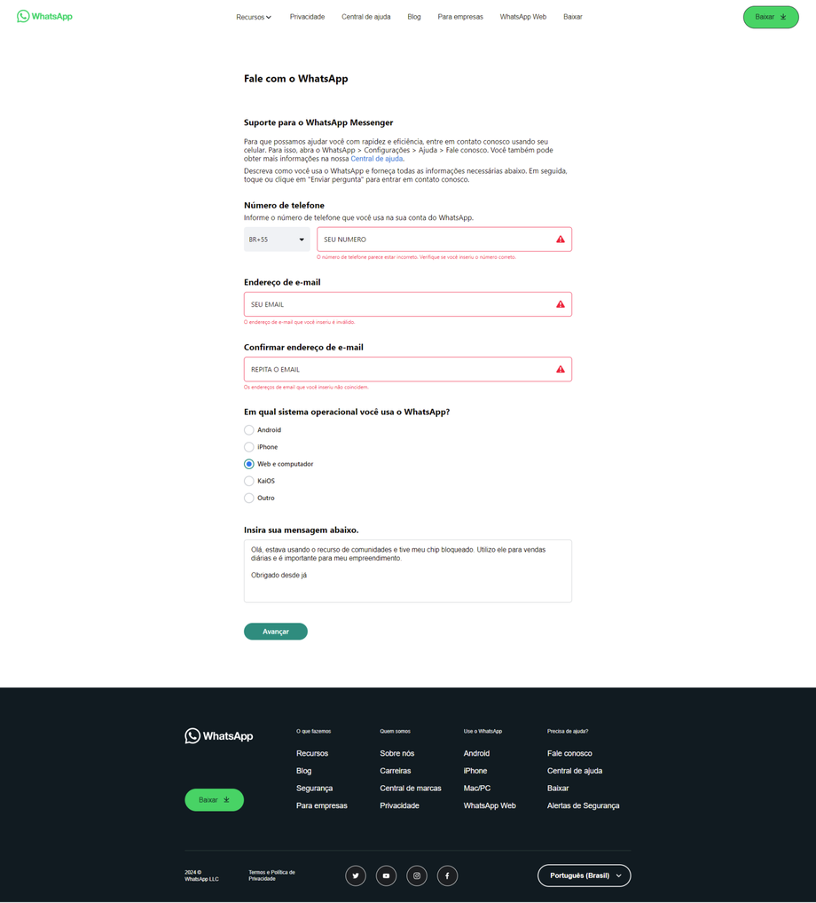 "Olá! Recentemente, tentei expandir o uso do WhatsApp usando comunidades e listas de transmissão, para alcançar meus contatos de forma mais eficiente. Infelizmente, meu número acabou sendo bloqueado. Preciso urgentemente de ajuda para desbloqueá-lo. Você conhece algum procedimento ou contato que possa me auxiliar nessa questão? Agradeço qualquer orientação!"